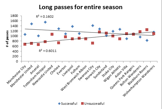 English soccer has been stereotyped as a game that features long passing. This label may be unfair or outdated as the game has progressed with time. Since Opta provides long passing statistics, I thought it would be interesting to look at long passing more in depth to determine if any trends could be identified that related to success in 2011-12.